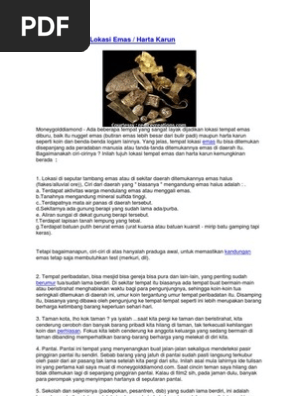 Biasanya kita melihat para penambang emas melakukan tambang pada daerah sungai. Ciri ciri pasir mengandung emas. Lebih menyayat hati, mayatnya tidak dapat dikeluarkan atas faktor keselamatan pegawai bertugas. Memiliki lapisan tanah lempung yang tebal. Cara mengetahuii sungai yg memiliki kadar emas nya.